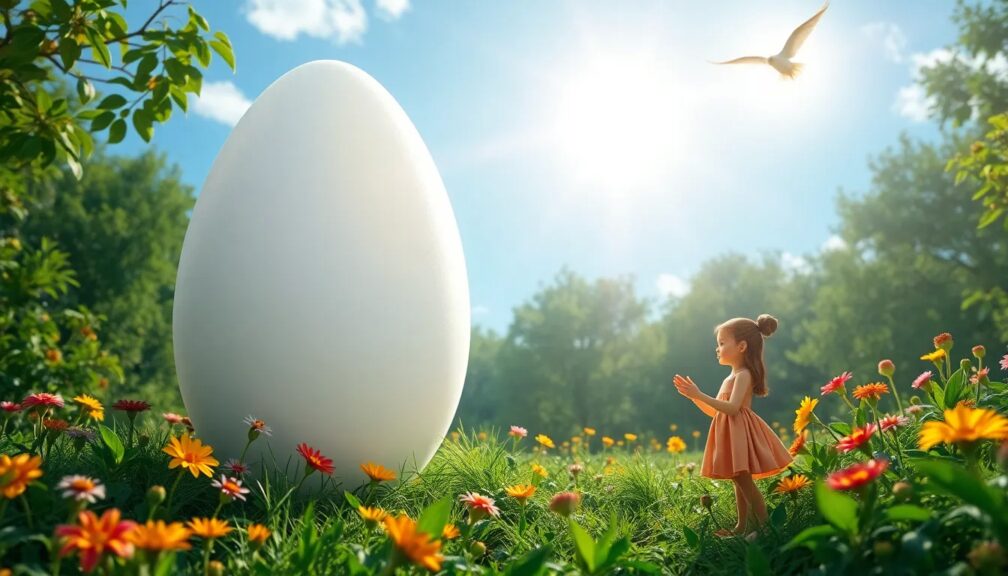 Un día, mientras paseaba cerca de un gran árbol baobab, Nia encontró algo extraño. En la sombra de un arbusto, vio un enorme huevo. Nunca había visto algo tan grande antes. Pensó que debía haber sido dejado allí por algún animal, tal vez un avestruz, que a veces ponía sus huevos en la tierra abierta. Pero este huevo era mucho más grande que cualquiera que hubiera visto antes. Era blanco y brillante, como una piedra preciosa, y parecía que emitía una suave luz dorada.