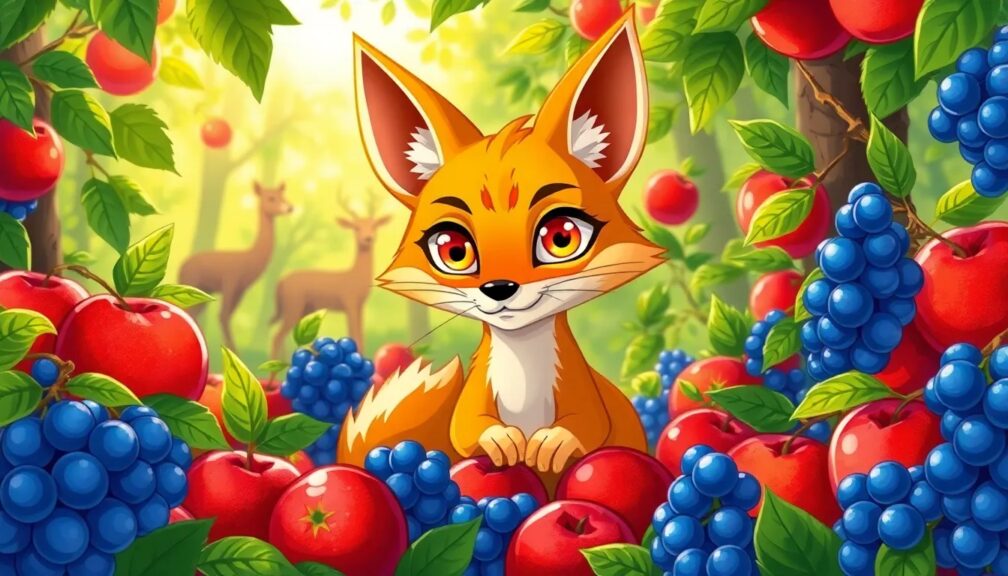 Un día caluroso de verano, mientras caminaba por el bosque, Zora olió algo que la hizo detenerse de inmediato. En lo alto de una colina, colgaban de una enredadera unas uvas tan brillantes y jugosas que parecían tener un brillo dorado bajo el sol. Las uvas eran grandes y maduras, listas para ser recogidas, y Zora, al verlas, sintió que su estómago rugía de hambre. Sin pensarlo, comenzó a saltar y dar vueltas alrededor del arbusto, buscando una manera de llegar hasta ellas.